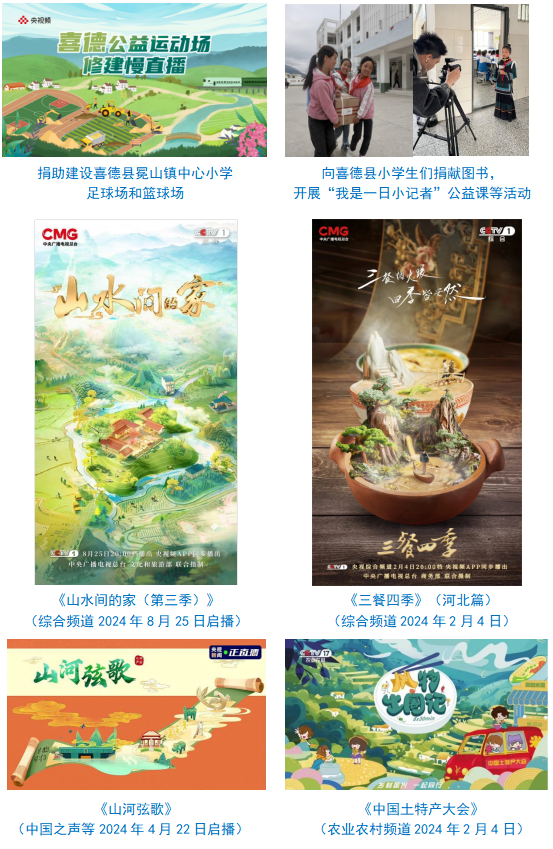 赋能乡村振兴■◆■★。定点帮扶四川喜德县,培训基层干部、乡村振兴带头人、专业技术人才2435名。发起《“喜”迎丰收 “德◆■◆”天独厚》公益直播带货活动★■,成交额超1.2亿元。《山水间的家(第三季)》《三餐四季》《山河弦歌》《中国土特产大会》等节目聚力文旅合作■◆◆★◆■,为乡村振兴提供新动能◆■。